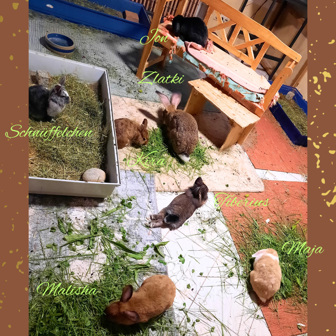 Da bin ich, Schnüffelchen und der große Zlatki, den alle mögen, jeder will sein Freund sein. Malisha, Maja und Kira, die anderen Mädels neben mir. Und Tiberius und Jon, die Jungs. Im Großen und Ganzen verstehen wir uns alle sehr gut, nur hin und wieder spielt der eine oder andere „Fangen“ 😉.