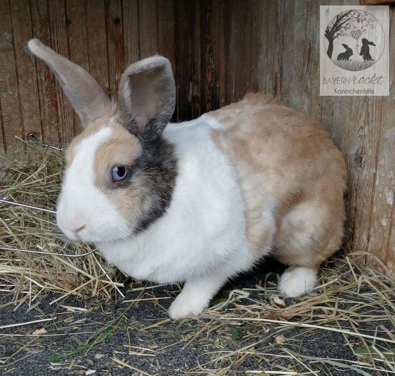 Er ist ein sehr selbstbewusster Rammler. Seit Ende Januar 2024 hat er eine Mittelohr- und Innenohrentzündung. Erst zeigte sich eine Kopfschiefhaltung und Gleichgewichtsprobleme. Er konnte nicht mehr hoppeln und hat sich ständig um die eigene Achse gedreht. Sein Zustand war sehr kritisch und er musste eng gehalten werden, um ihm zu helfen. Allerdings zeigte er uns einen tollen Lebenswillen. Dass Futter hat er gut aufgenommen und die Behandlung super mitgemacht. Nach einiger Zeit hat sich sein Zustand soweit gebessert und er konnte die Box verlassen. Sein Kopf wird schief bleiben. Er kommt mit seinem Handicap sehr gut zurecht und genießt sein Leben.